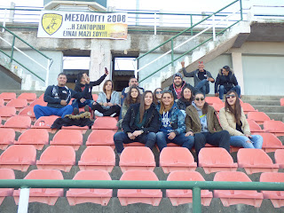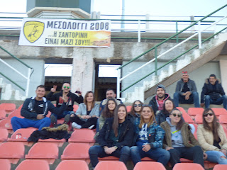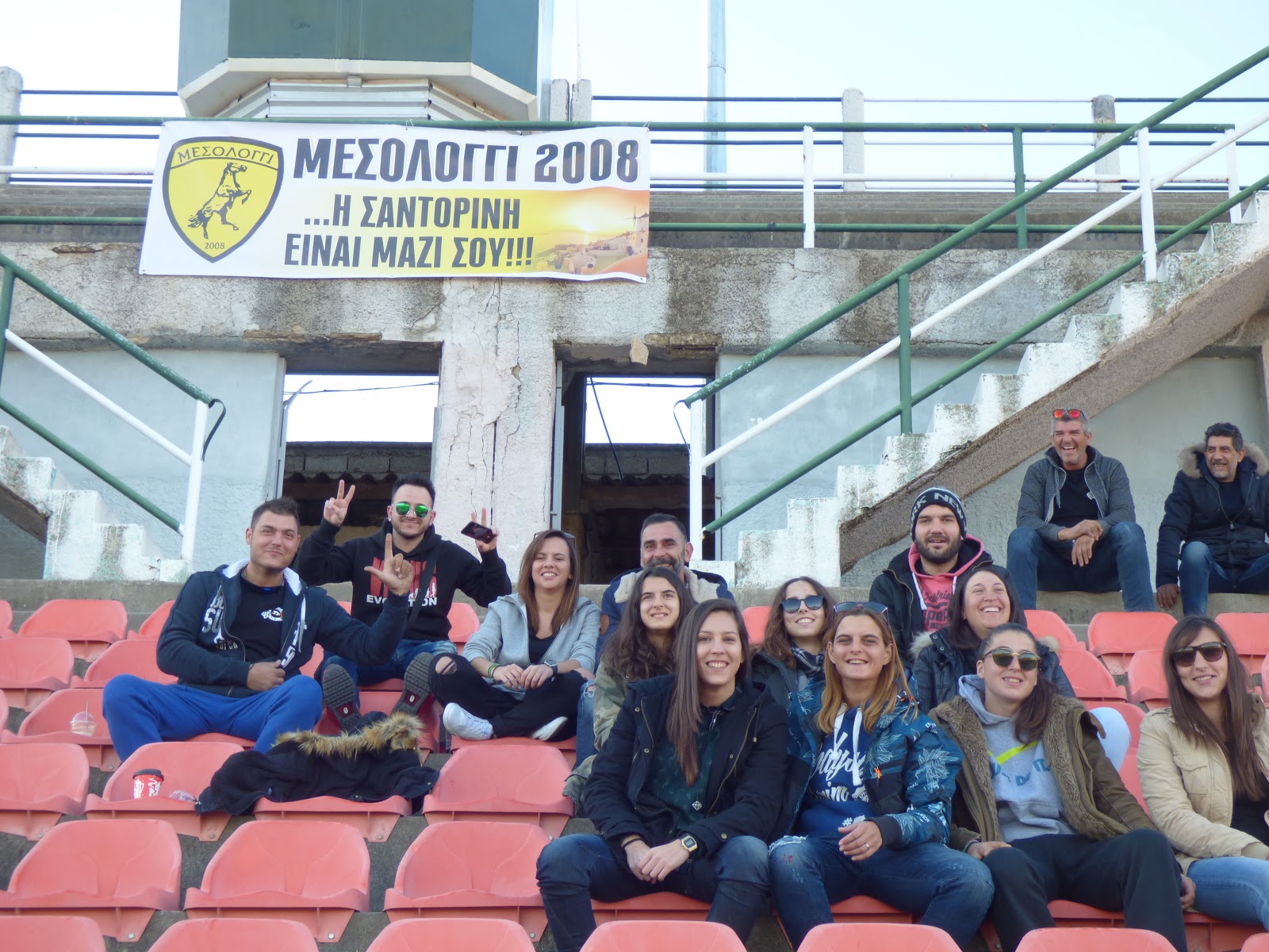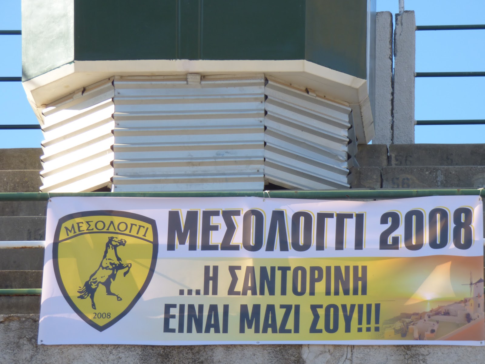 Ταξίδι έκανε απο την Σαντορίνη ο πρόεδρος του Μεσολόγγι 2008 κ. Καρακώστας Ευάγγελος για να βρεθεί κοντά στην ομάδα.Στην φωτογραφία διακρίνεται με τον βετεράνο Μεσολογγίτη αμυντικό Κυρίτση Χρήστο, κάτω απο το πανό που κρέμασαν στην κερκίδα του ΔΑΚ Αργους..με λογότυπο συμπαράστασης απο το νησί των Κυκλάδων !!!!!!!!